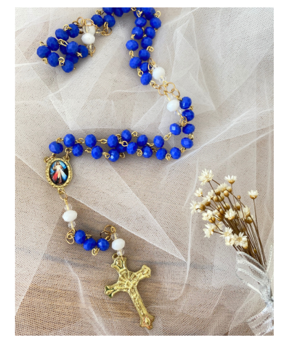 Terço feito no contra pino dourado, com pedras em cristal de vidro na cor azul royal leitoso e pai nosso branco leitoso, com entremeio de Jesus Misericordioso e crucifixo