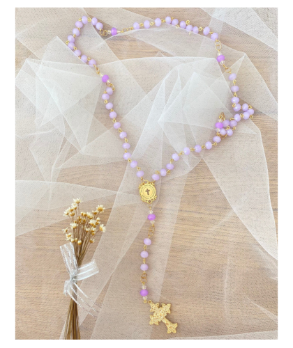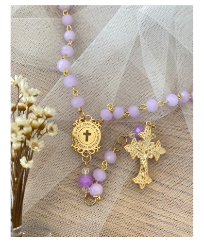 Terço feito no contra pino dourado, com pedras em cristal de vidro na cor lilás claro e pai nosso lilás escuro, com entremeio da Oração de São Francisco e crucifixo delicado