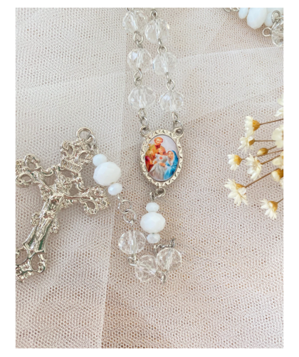 Terço feito no contra pino prata, com pedras em cristal de vidro na cor transparente e pai nosso branco, com entremeio da Sagrada Família e crucifixo delicado